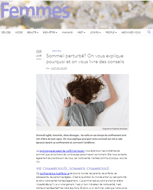 - Leupe, J. & Mouton, E. (2020). « Sommeil perturbé? On vous explique pourquoi et on vous livre des conseils ». Femmes d’Aujourd’hui Magazine. Bruxelles, Belgique : Roularta Media Group.